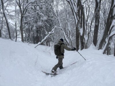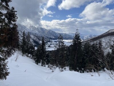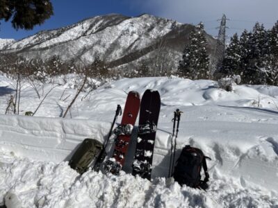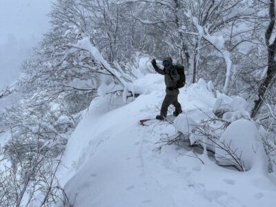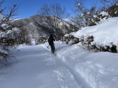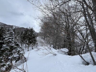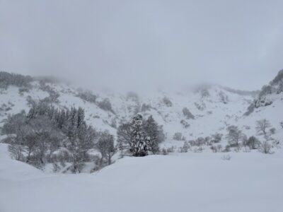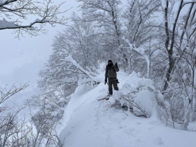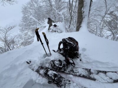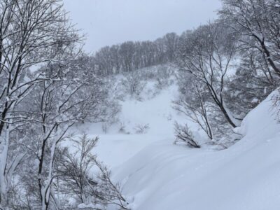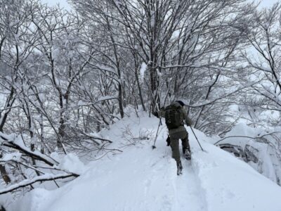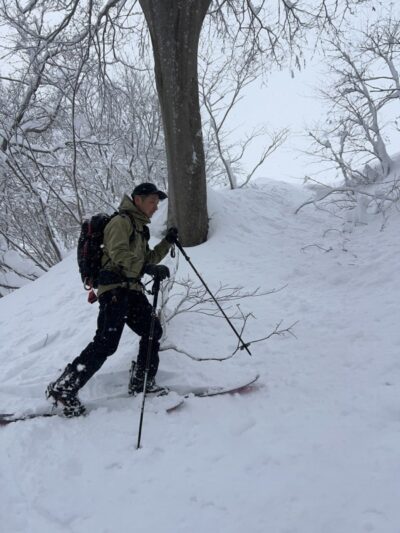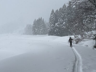 前日の藪地点で突然の吹雪に襲われてビビって2本目の下山滑走。