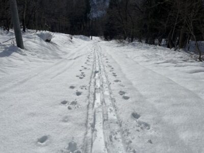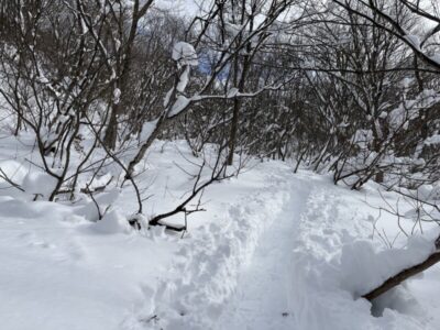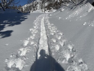 前日のトレースもシュプールも残っていて歩きやすいが雪は昨日より重みを増している。