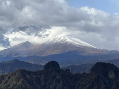 真正面に昨日拝んだ浅間山が初冠雪で白い雪化粧で現れている!すごいぞ。