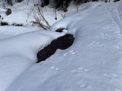道路脇は融雪してる箇所があった。これを見ると積雪は30㎝程度。我が家のほうが多い。
