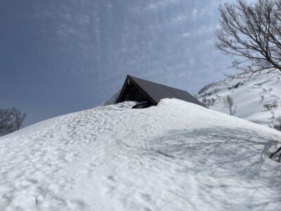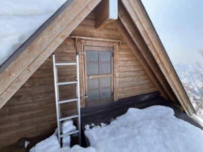 二階から出入りできたので、ここで小休止。なかには石油ストーブがあったが燃料は入っていないので暖を期待してはいけないが雪上で寝るのとは段違いで快適なはず