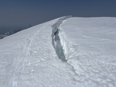 避難小屋まで歩きたかったが、大きなクラックもあり、雪が落ちていたりでとてもいける状況ではなかったのでここで引き返す。